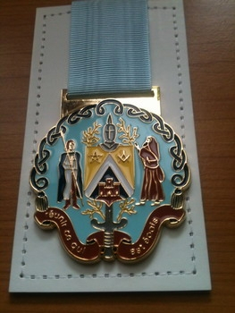 Très belle médaille, diamètre 50mm, finition dorée. Montée sur ruban ciel 30mm et planchette port en poche poitrine.