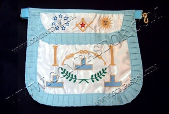 en satin lourd, brodé : équerre, compas, étoile, G, lune étoilée, soleil, chaîne d'union, acacias, 2 colonnes