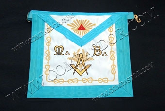 Tablier Maître avec poche - En satin, M.B., équerre/compas, Delta rayonnant sur bavette, G, Lacs d'Amour, acacia, brodés