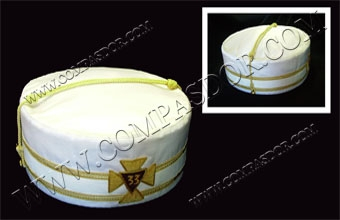 Toque blanche, satin, brodée main, croix-triangle et 33. Indiquer la taille (du 56 au 62).
